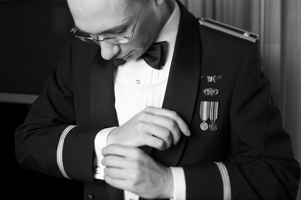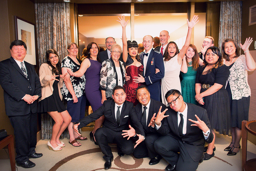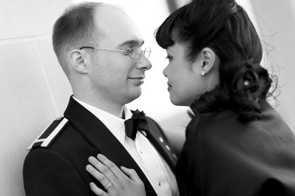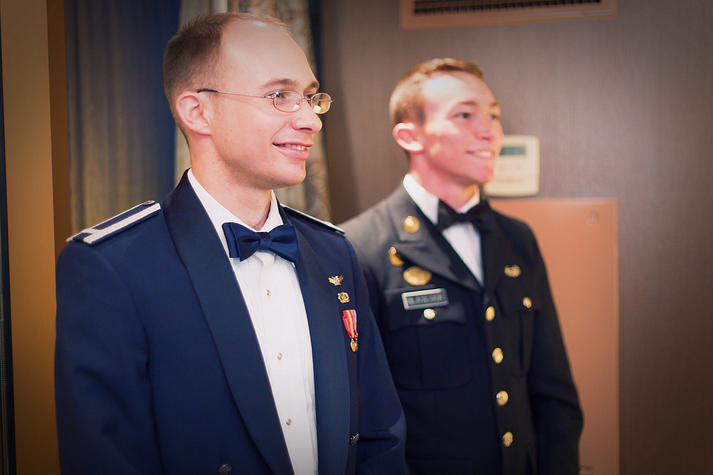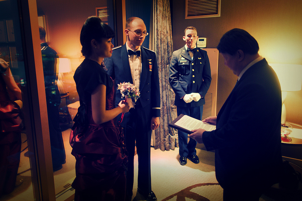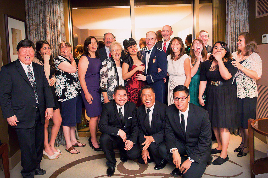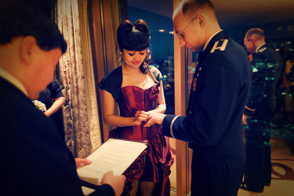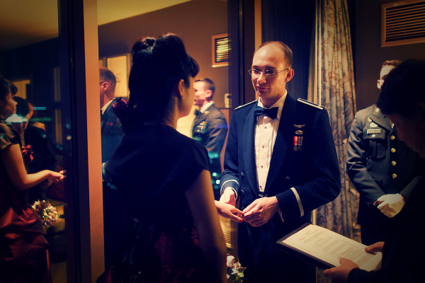 We didn’t have a rehearsal since we figured that it wasn’t needed for a small wedding, so everyone just winged it. However, that didn’t mean that we were free from slip- ups! Michael messed up some of the words when he recited the vows after our pastor, which initiated some chuckles and giggles from me and the guests. But it was all in good spirit; we all learned to laugh along and just roll with it. I also did not expect my groom to have a shirt with funny-looking sleeves underneath his Air Force mess dress! Everything thought that he was just wearing the standard white shirt, so him taking off his coat to reveal that was definitely a hilarious surprise.