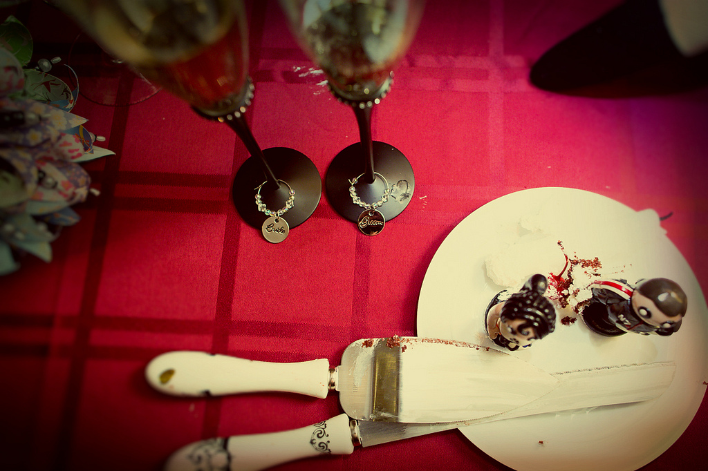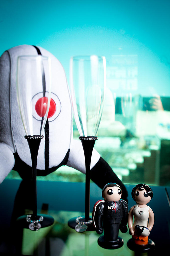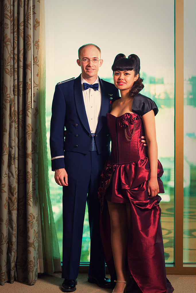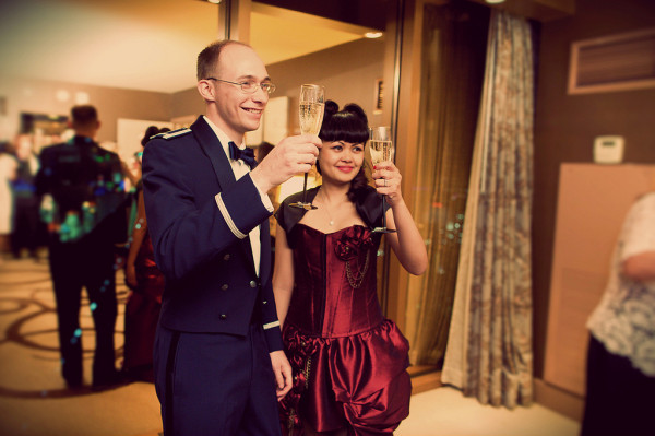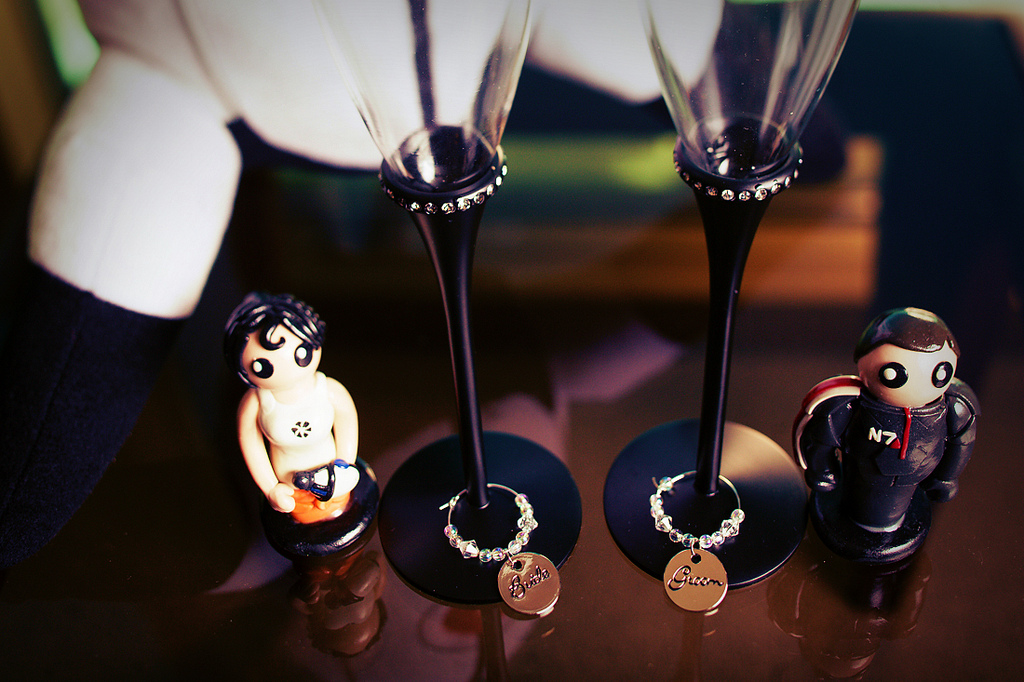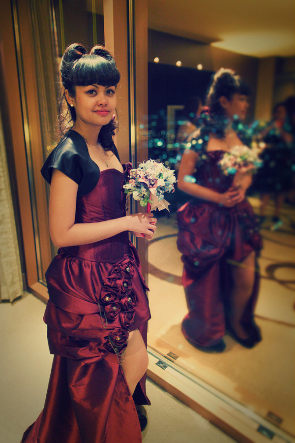 We wanted a wedding that showed off our personalities and shared interests: we both liked video games, so we included some of that in our ceremony. The Portal and Mass Effect games are significant to us because my groom and I first met when Portal 2 just came out, and he was the one who introduced me to the Mass Effect games. I also liked all things vintage and romantic, and my groom didn’t mind as well — so long as I wore a corset. ;) This worked out well for the both of us since I was able to wear a Victorian Steampunk-inspired, burlesque dress that was modified to go with my wedding theme. The wedding dress was a nice, wine red color instead of the typical white since I wanted to put at least a little bit of practicality to it. That way, I can re-use my dress for other occasions (such as Renaissance Festival or military dining-outs) instead of wasting money by wearing it only once and trashing it.