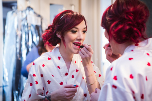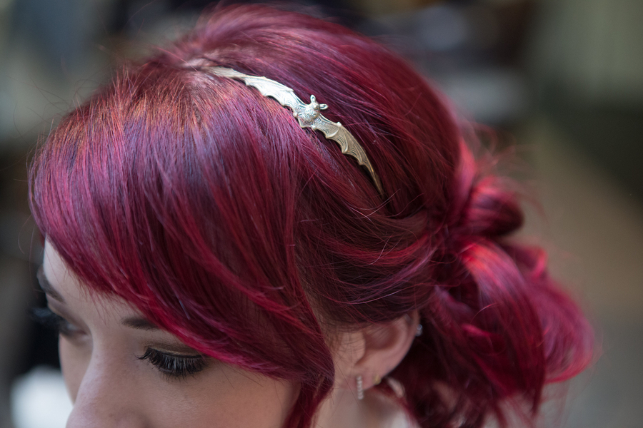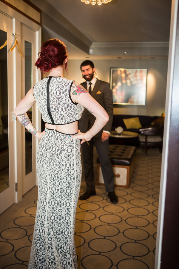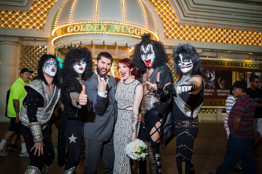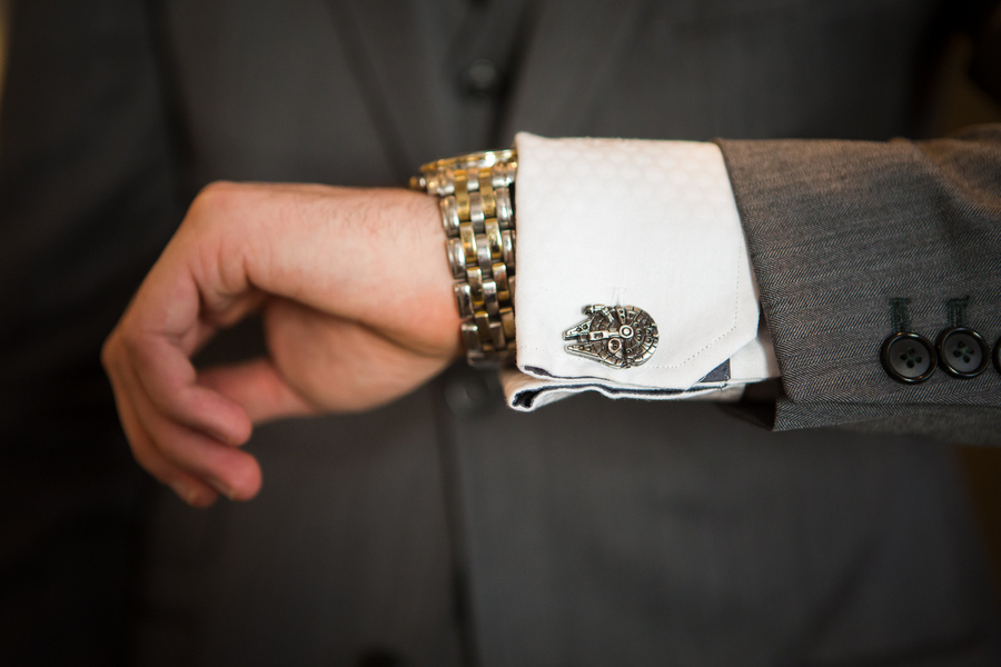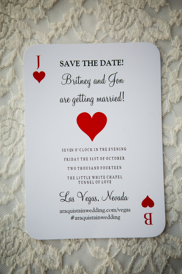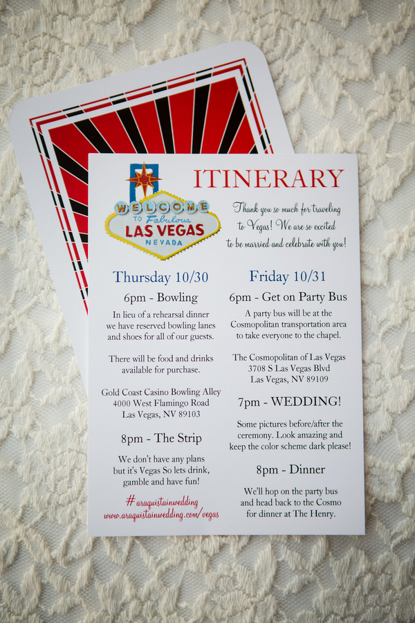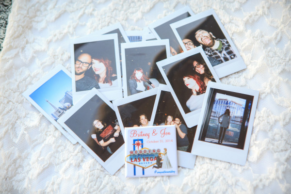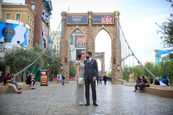 This destination wedding was on the intimate side, but Britney and Jon were able to infuse many personal touches into the day, including a custom LEGO minifig cake topper, playing card stationery and super cool Millennium Falcon cufflinks. A touch of Halloween was included in the glam gold bat headband Britney wore. Keep reading for more about this unique Vegas wedding from their photographer!