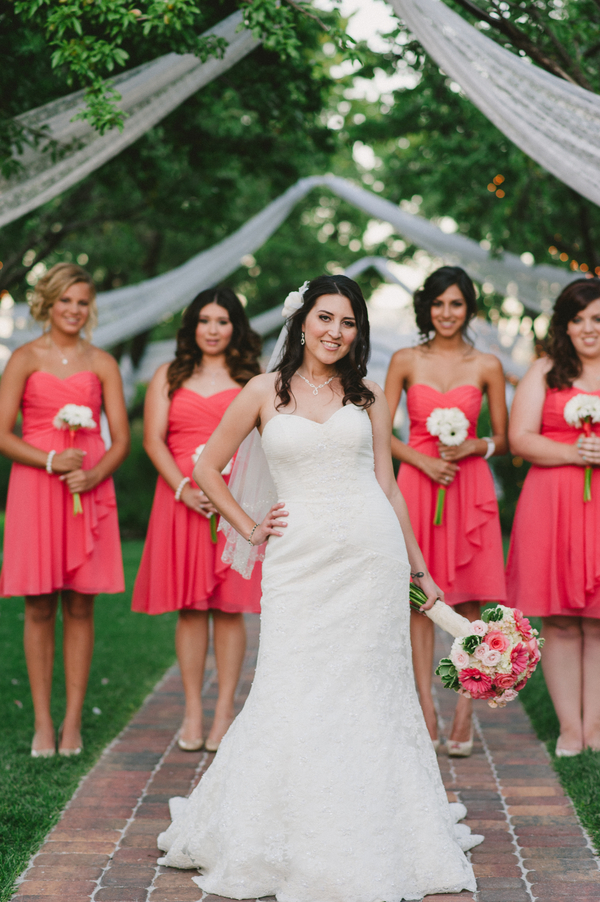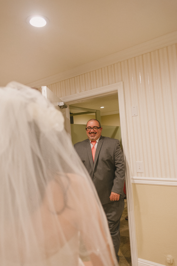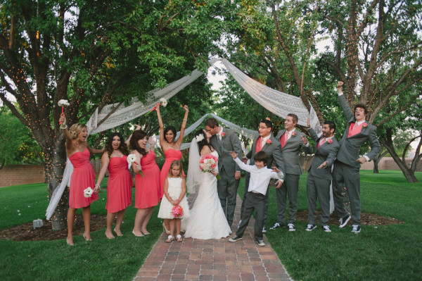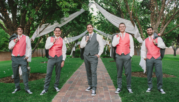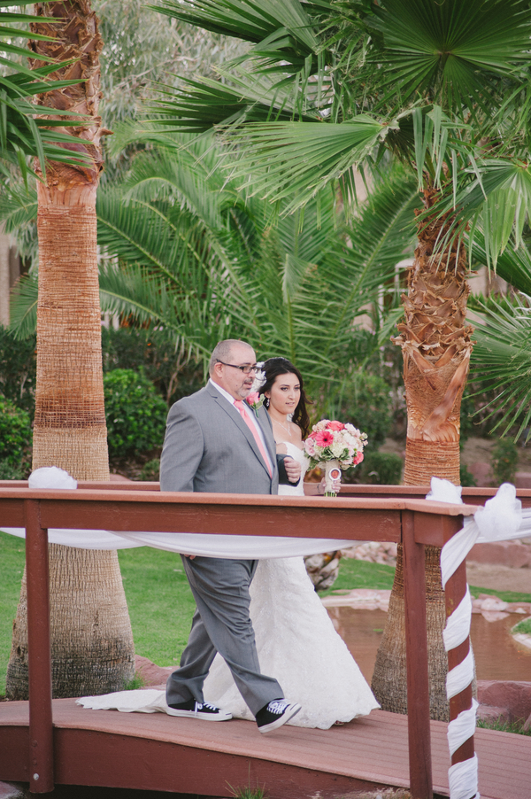 The bridal party wore bright coral and grey and looked like they all had a blast as they partied into the warm Vegas night. So many dramatic moments caught on camera, too, from the father-daughter first look to the sparkler exit — one of the best I’ve seen! (There aren’t very many places on The Strip that allow sparkler or fireworks, so The Grove is a place you should consider if that’s important to you.) Read on for more details from the bride: