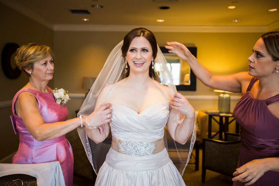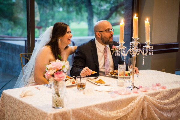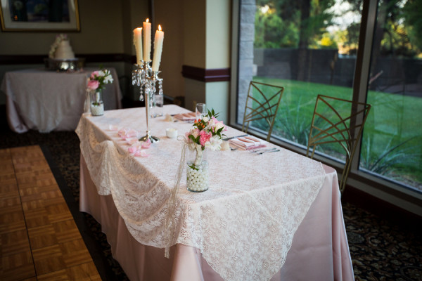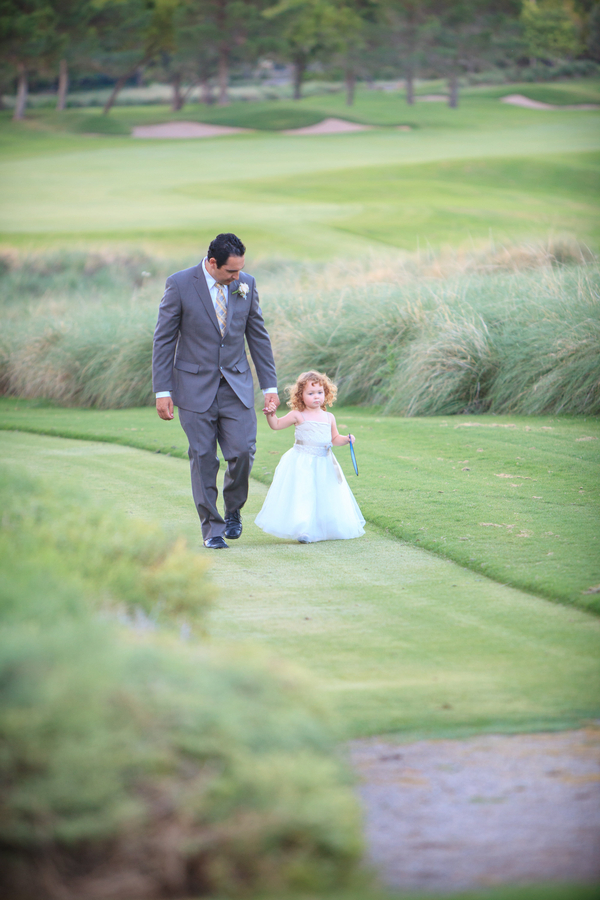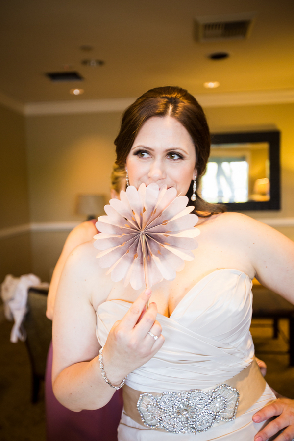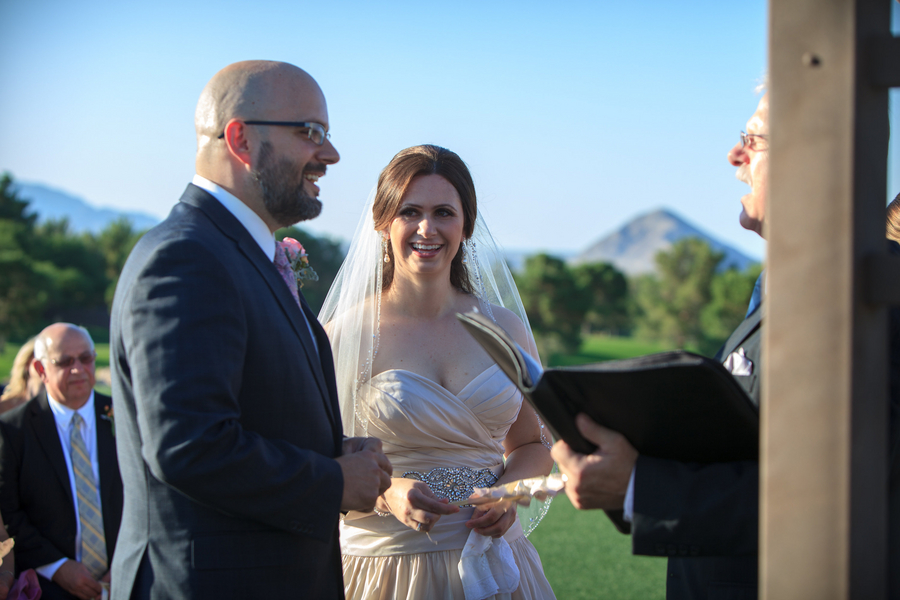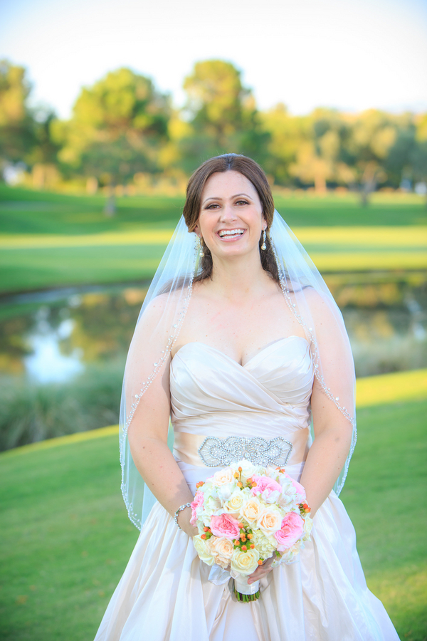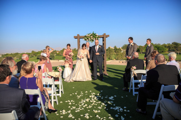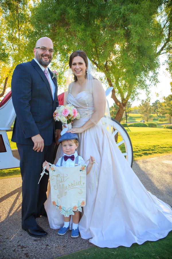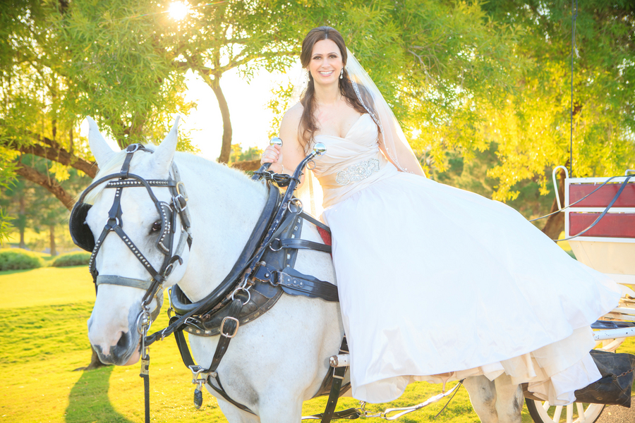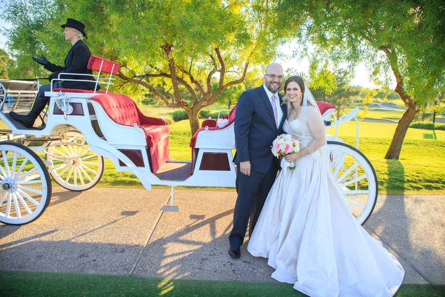 A fairytale wedding and a gown fit for a princess are what a lot of young girls dream about when they think of their future wedding. I’m inclined to believe that my bride Jackie was one of these little girls because when I arrived at TPC Summerlin to photograph her big day the scene before me was definitely fairytale-worthy. The lush grounds of the golf course provided a picturesque ceremony backdrop while the reception hall was embellished with candles, lace, fresh flowers, and accents of pink and gold. When I saw Jackie in her blush-colored ball gown complete with a Julia Roberts wattage smile on her face she could have put Disney princesses like Cinderella and Belle to shame. In a word – gorgeous. And it was only fitting that this fairytale princess bride made her grand entrance in a horse and carriage.