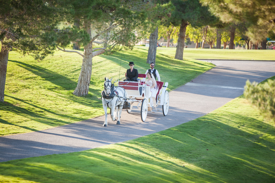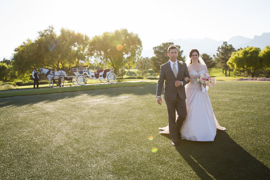 Jackie and John married in classic country club wedding style at TPC Summerlin. Expansive greens and views of the Red Rock mountains for their outdoor ceremony and a blush pink wedding dress and pink and gold wedding reception palette added up to their romantic day. Completing the fairytale-esque wedding? A horse-drawn carriage entrance. Read on for more details of their fabulous Vegas wedding!