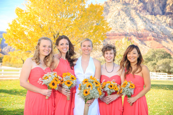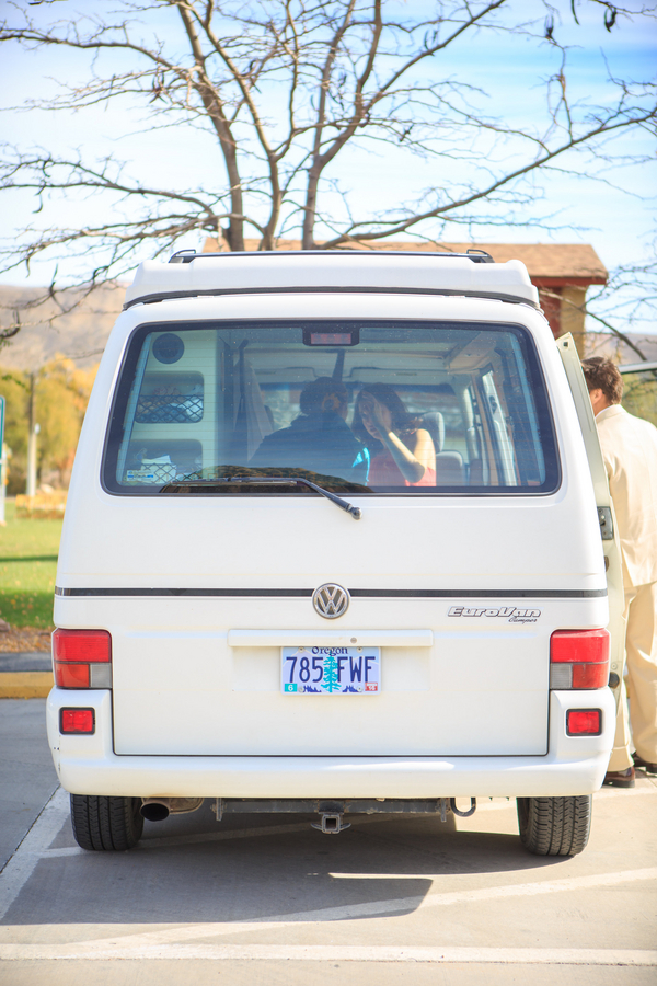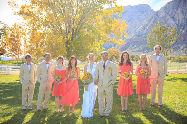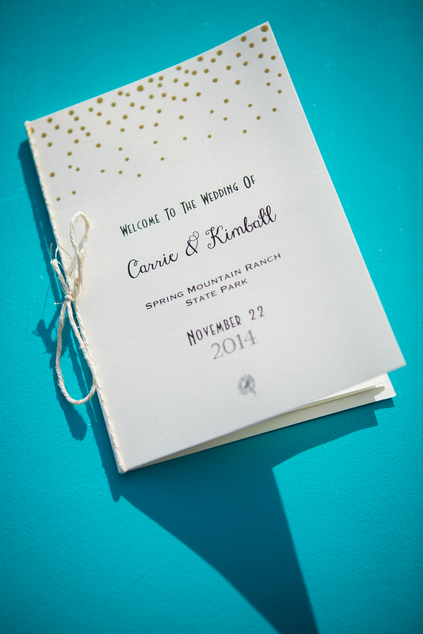 For rock climbers and Vegas locals Carrie and Kimball, their wedding was all about their own personal relaxed style and the great outdoors! So much of their rustic wedding was DIYd or handmade by friends and family, keeping this a memorable experience for all involved. They even used their 1999 VW Eurovan Camper as wedding transportation and staging area, Carrie doing her prep and makeup in there! Super-sized lawn games entertained the crowd at this daytime wedding reception, and allowed the bride and groom to mingle with their guests in the beautiful grounds of Spring Mountain Ranch, overlooking the mountains they love to climb so much. Stunning.