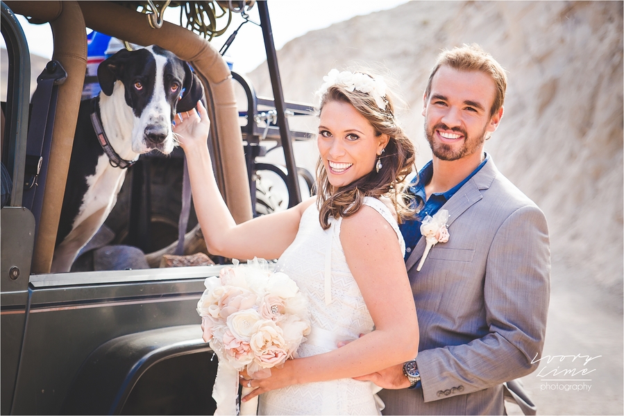 We’ll kick things off with a simple elopement-style shoot that showcases the natural simplicity of desert scenery and a couple’s intimacy. Rustic detailing, a vintage wedding dress and handmade accessories turn it into a gorgeous concept, perfect for low key couples. Can’t you just imagine these two whipping around the desert in a dune buggy in their wedding gear? Of course, you know I had to include it because of that darn cute dog, too!