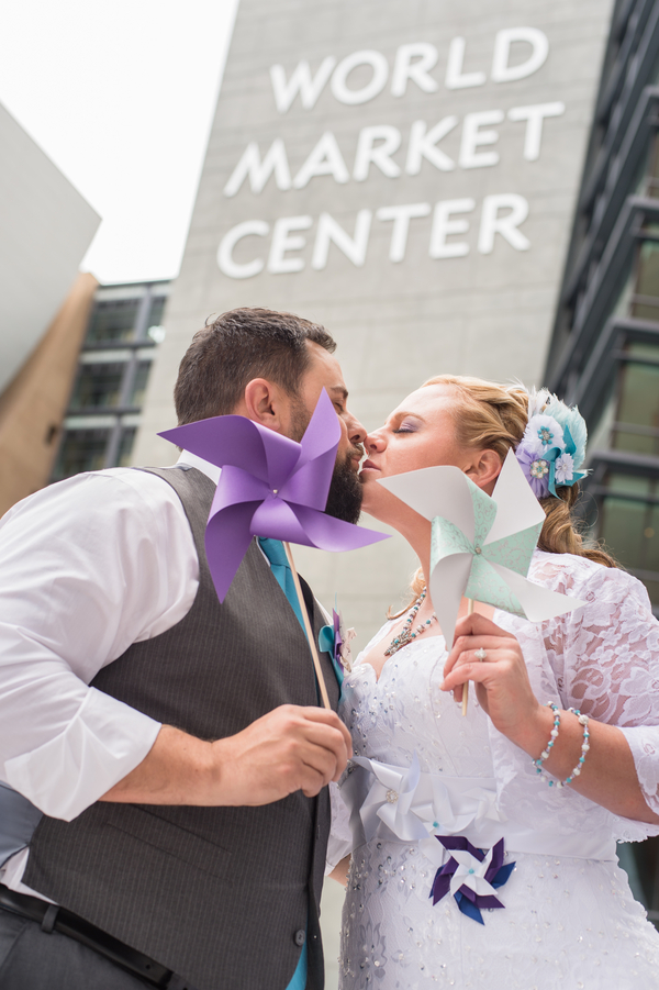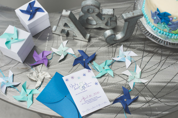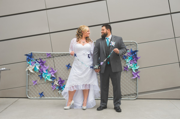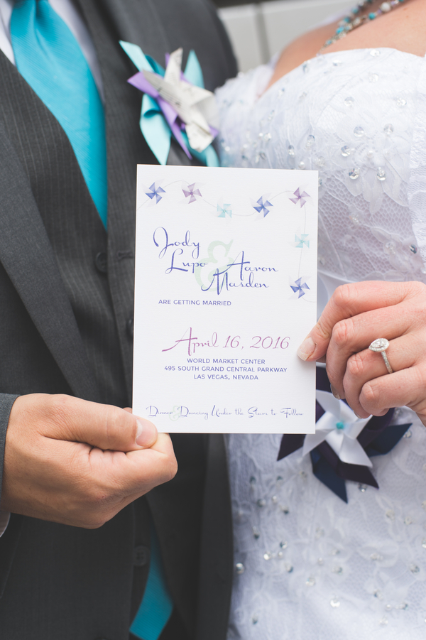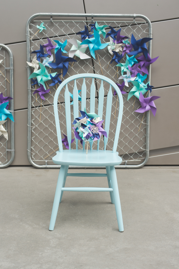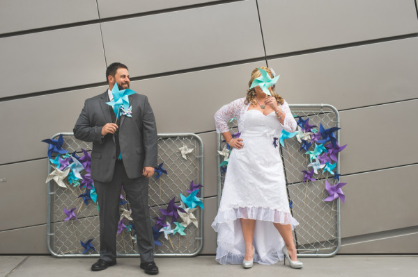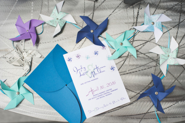 Pinwheels were the playful inspiration behind this teal, silver and purple styled shoot from Brilliant Imagery. What a perfect choice and color palette for the amazingly modern World Market Center Las Vegas! Who would have guessed the somewhat simple pinwheel (something I think we all relate with children) would make such a whimsical wedding theme? Not me! Perfect if you are planning an eco-friendly wedding, or are looking for alternatives to flowers.
