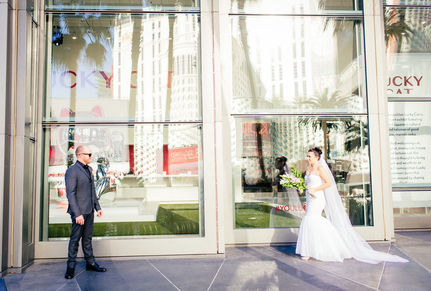 Both the bride and groom got ready at Cosmopolitan and chose to do their first look right on the Strip in front of the hotel. What an amazing idea this elopement was from surprise ceremony at the Neon Museum to the Strip photo tour to end the night.