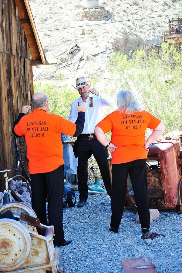 Instead of having mainly posed pictures, they opted to do fun pictures with themes and include their family in them. They brought some wild west themed clothes. They had a fake roulette game set up and had the dad playing for the girl. Nick won of course. Christy’s parents even put on some Property of Las Vegas jail shirts for some fun pictures of Nick capturing them as the sheriff.