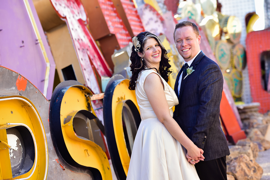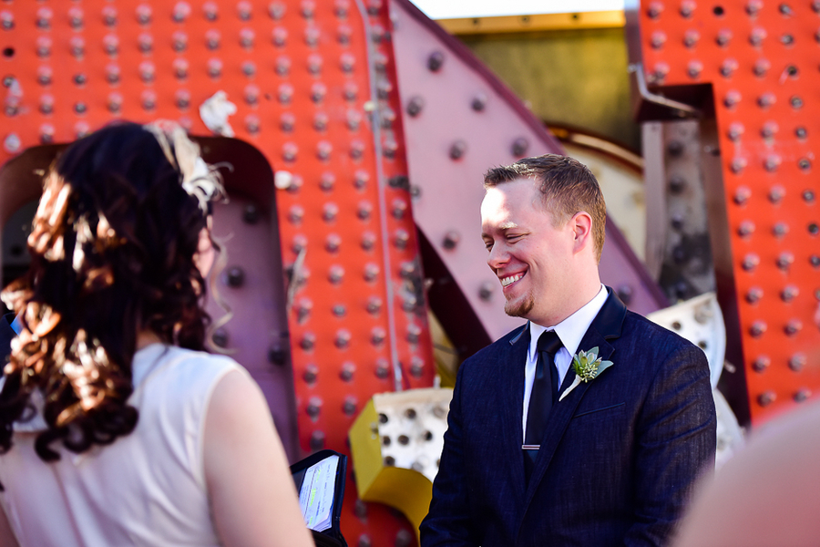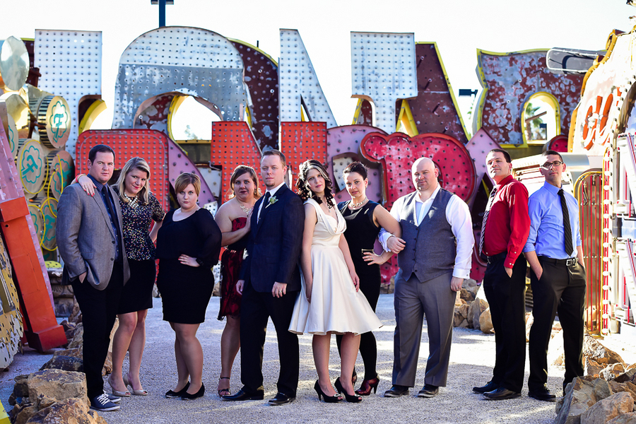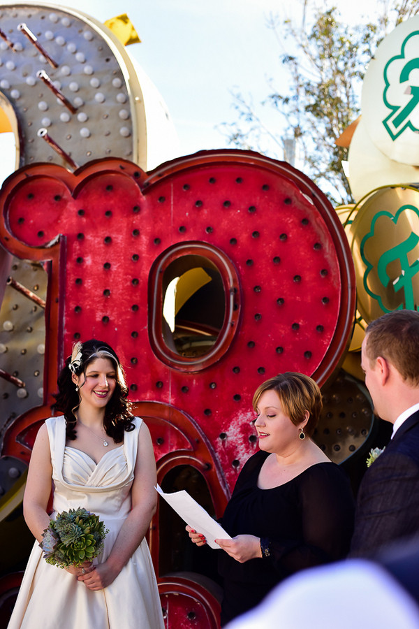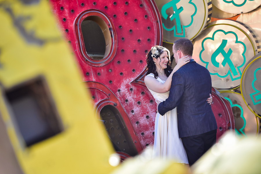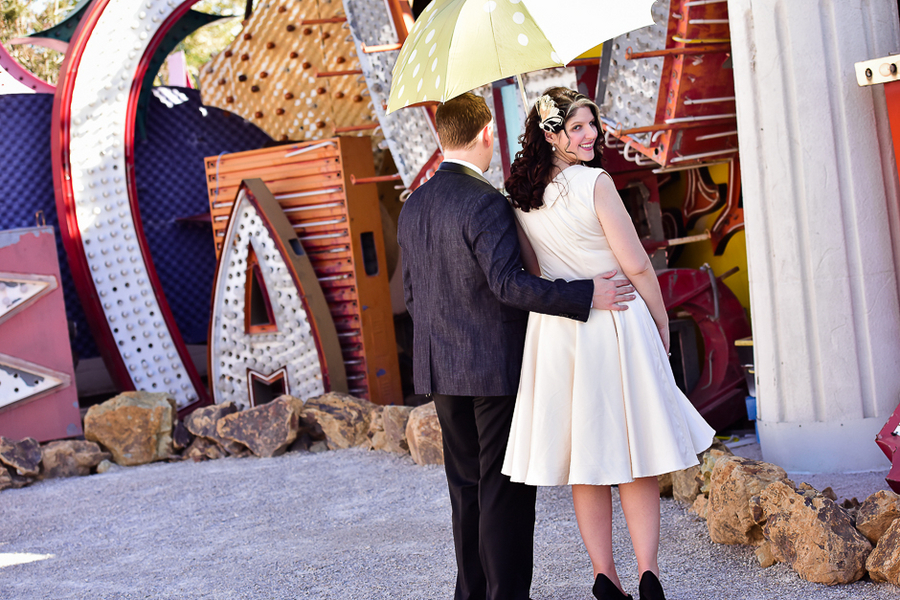 Brent and Leigh are a pair of booklovers who chose one of Vegas’s most historic locations for their ceremony: The Neon Museum. Nestled amongst the amazing retro signs, these two elected to involve their friends in their ceremony, having them read passages from favorite books and taking photos with them afterwards.