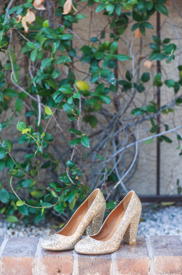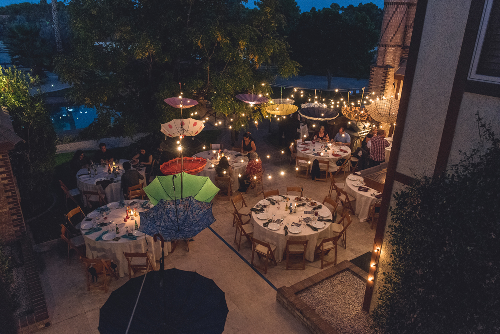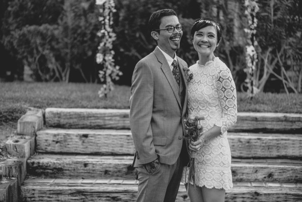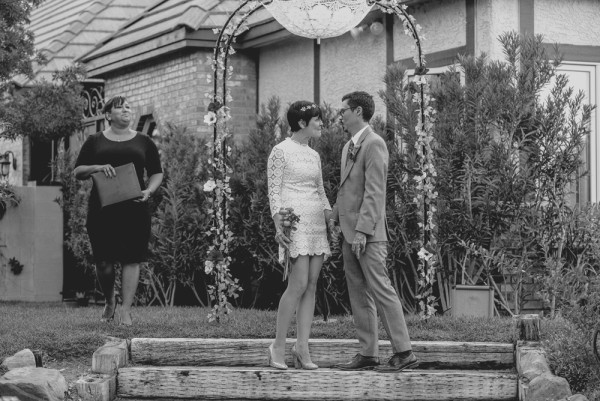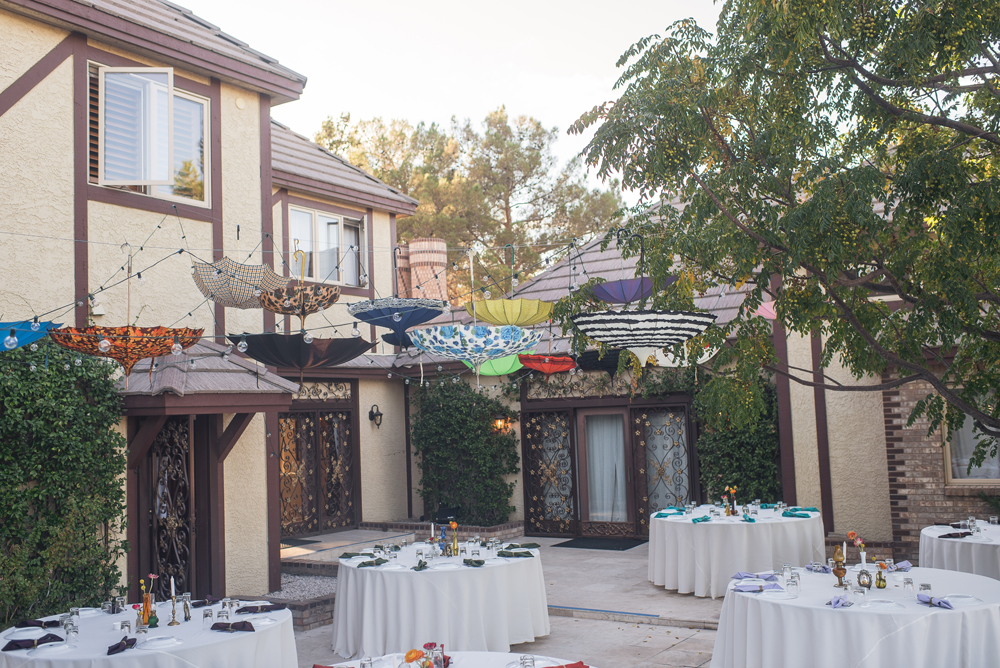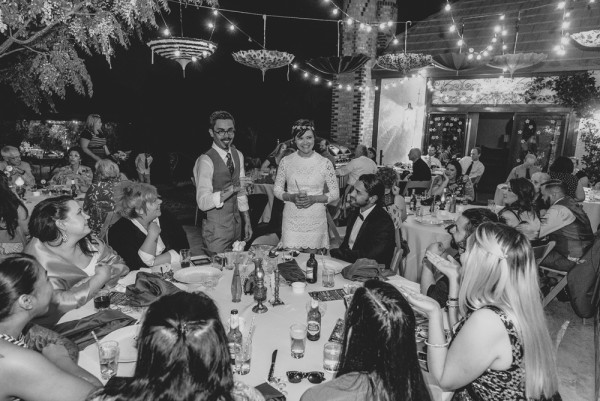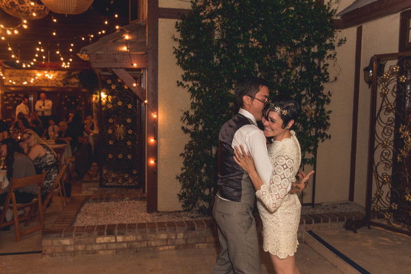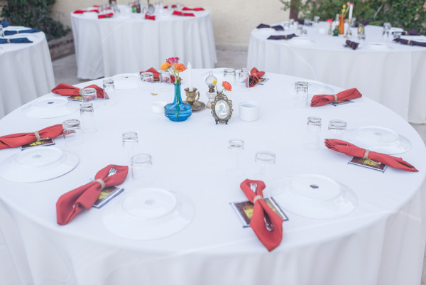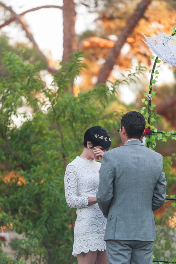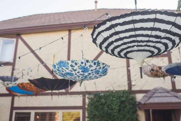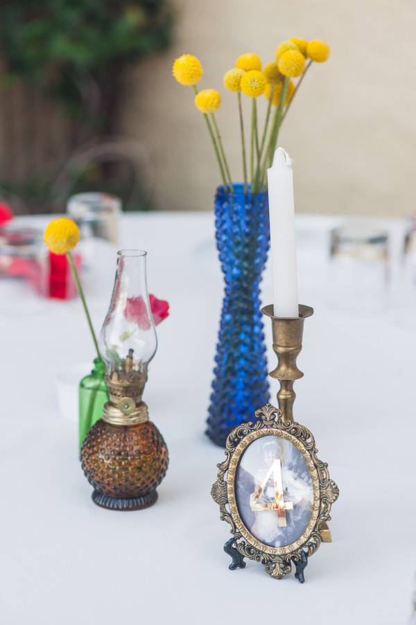 Lindsay and Ryan held their wedding in a fabulous villa they rented just for the occasion, using the opportunity to fill it with vintage touches. Going for an antique shop feel, the couple hung parasols and bistro lights above, and filled the tables with ornate frames and colorful glass vases.