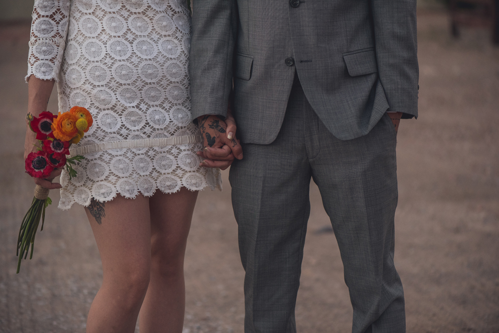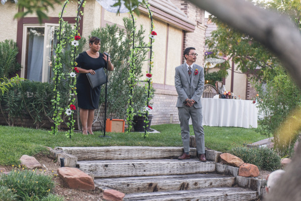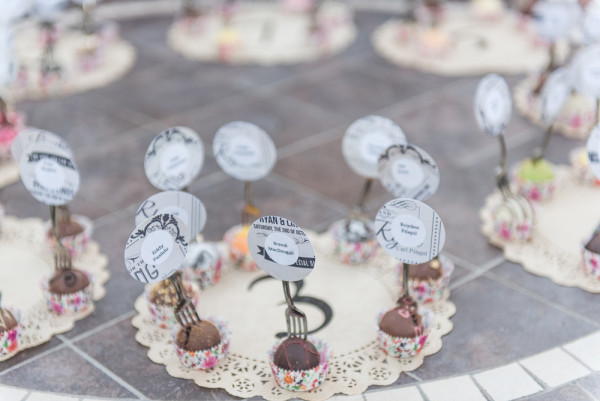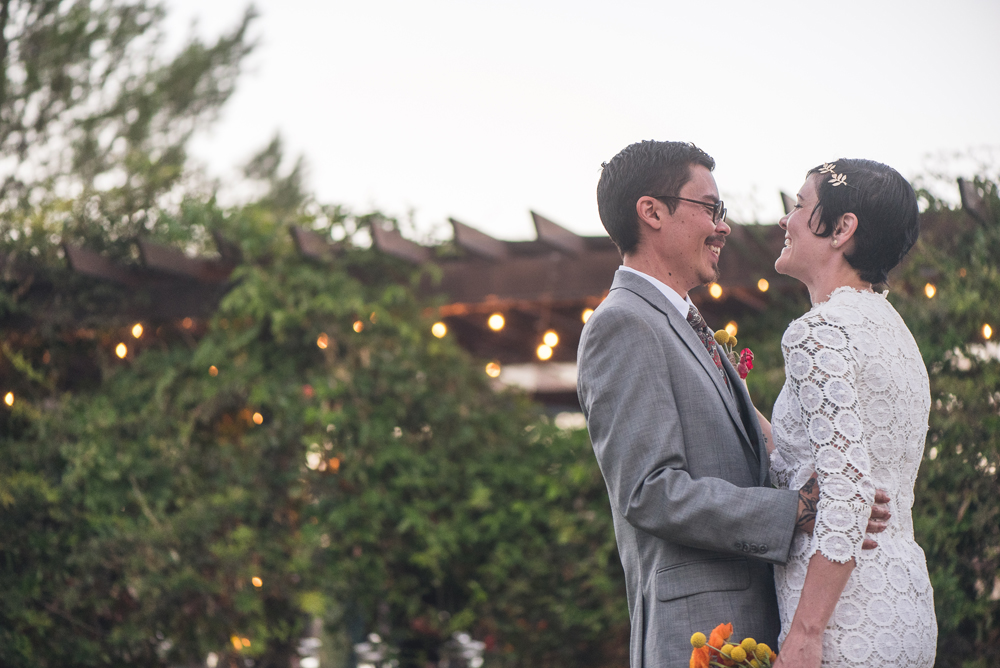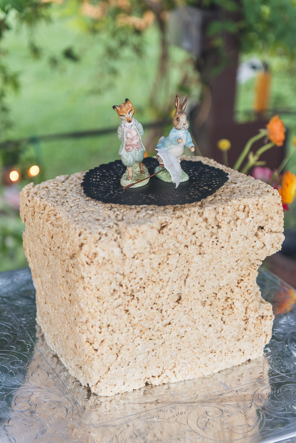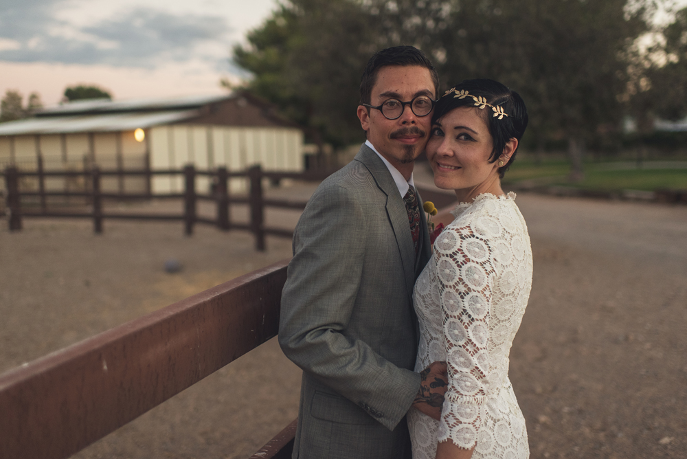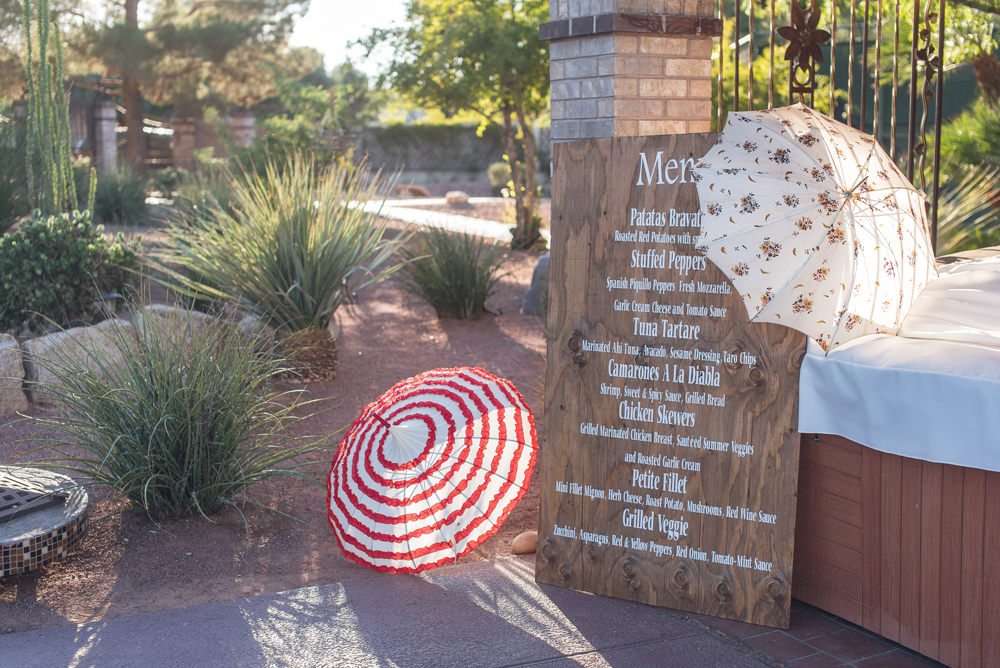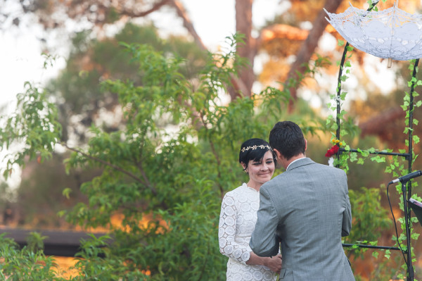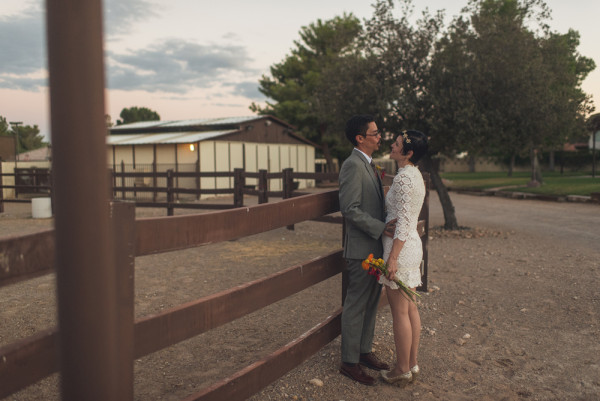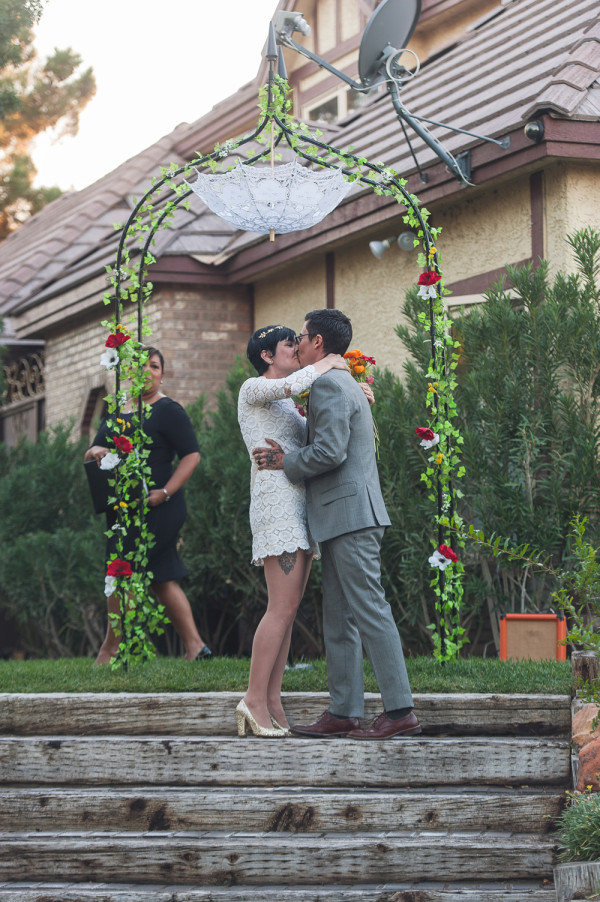 The tables were super pretty, from the umbrella shaped sugar cookie favors to a custom mix with music created by Lindsay and Ryan from the wedding. (The pair met while working at Tower Records in Vegas.) I think the dessert table has to be the crowing glory though: it’s a huge Rice Krispie cube (complete with a “bite” taken out as a nod to an episode of The Simpsons) and mini bundt cakes. A stunning laidback affair with a casual vibe that is just infused with personal details.