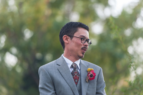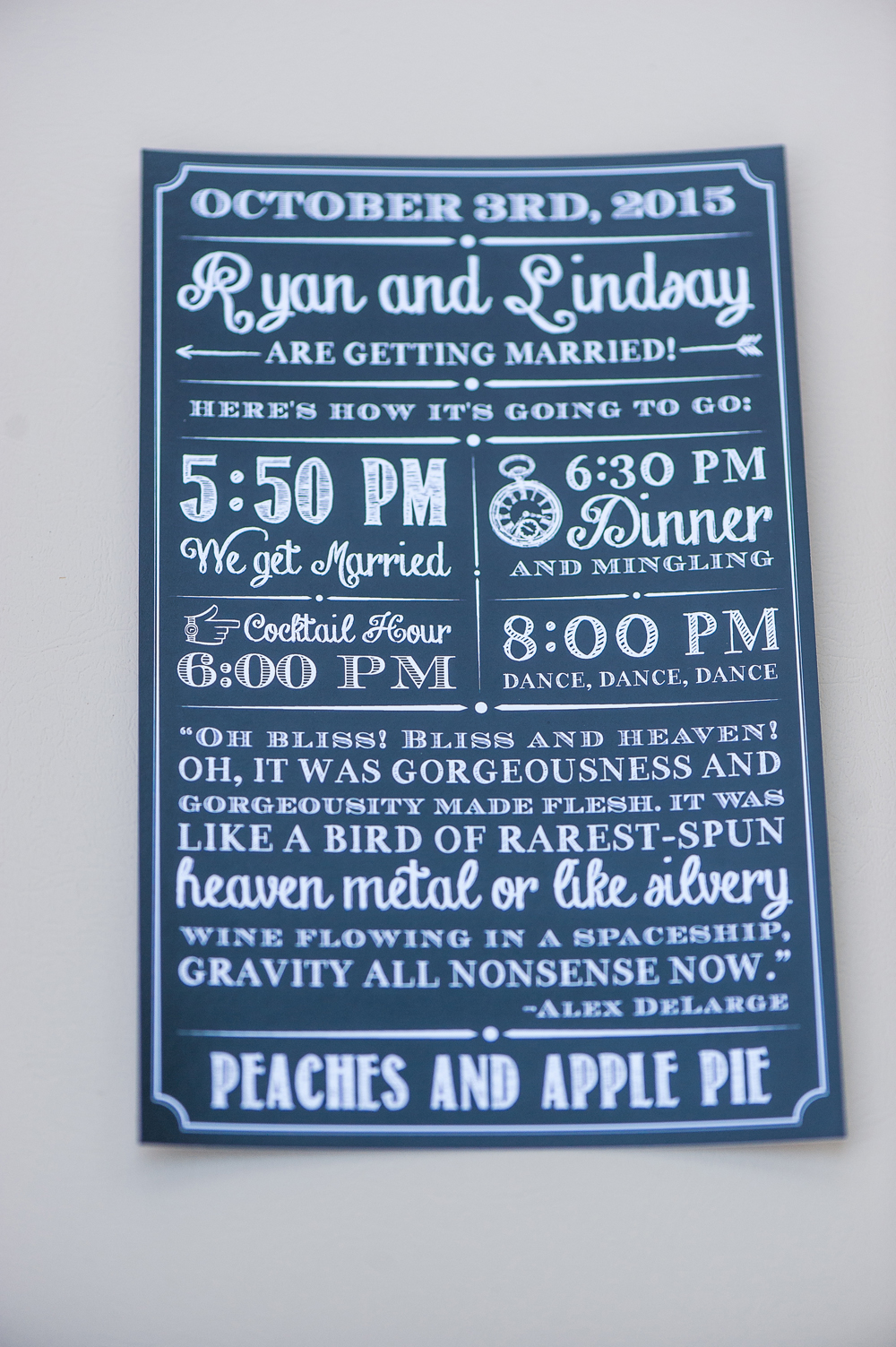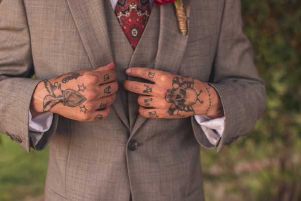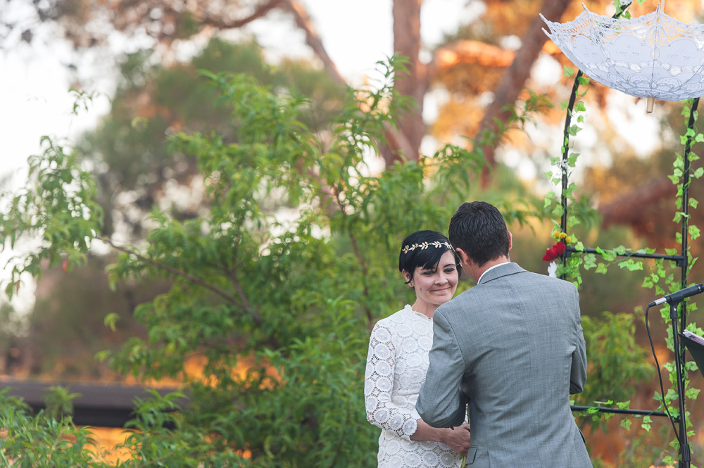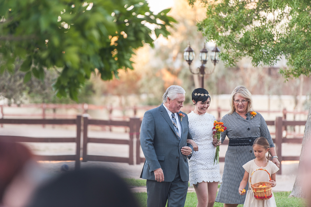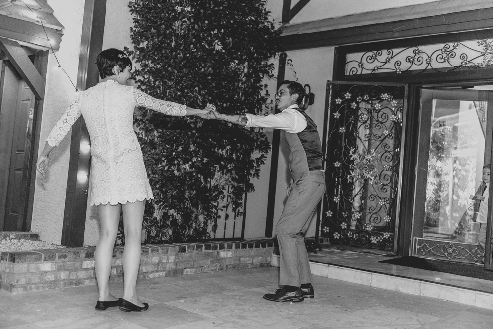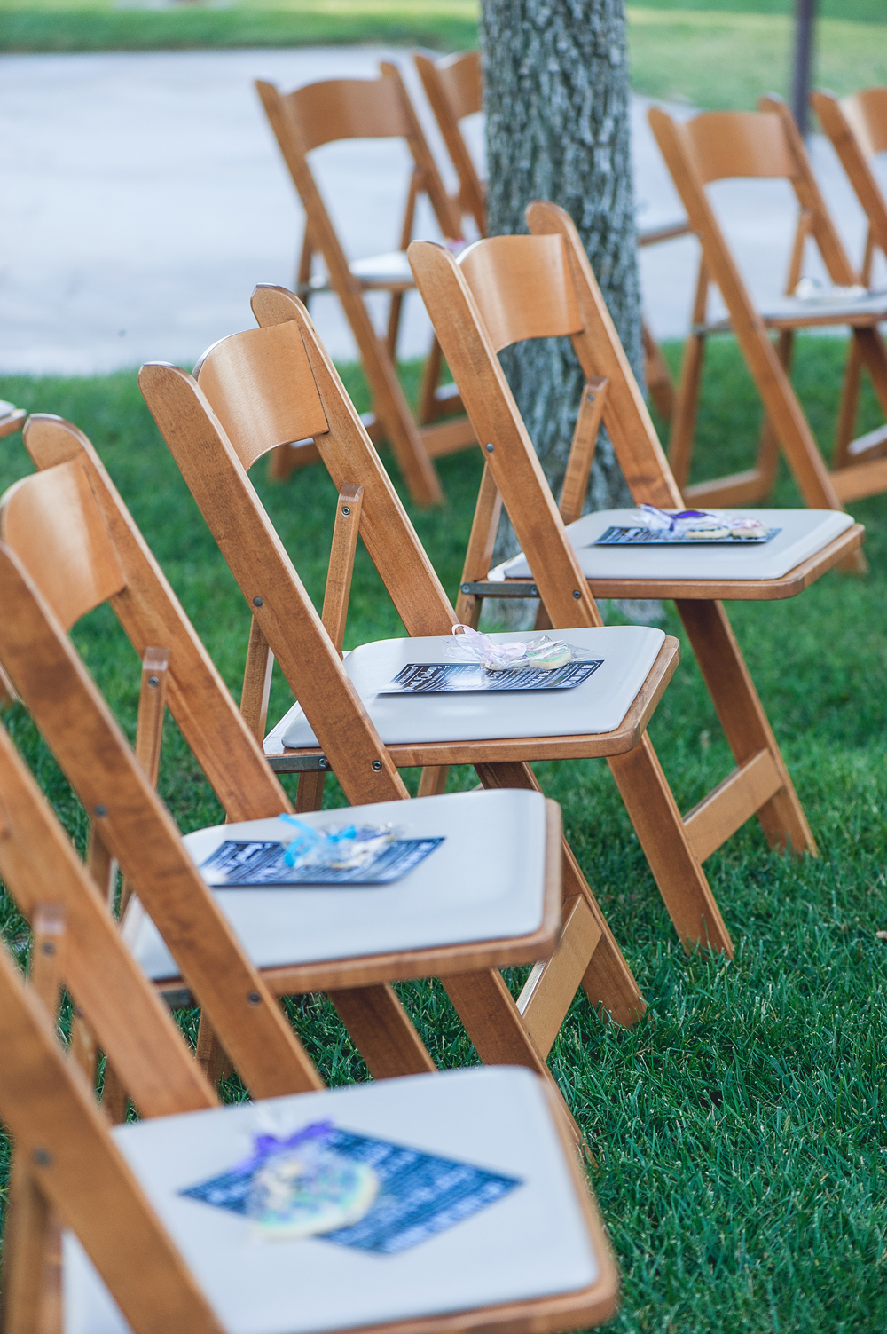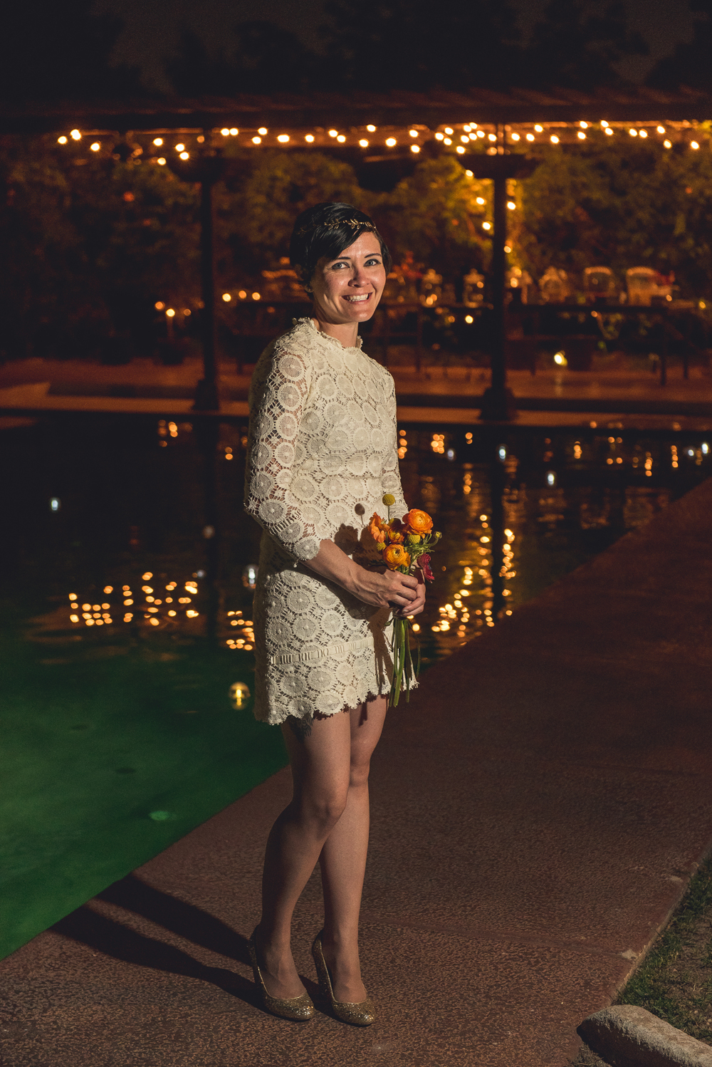 The tables were super pretty, from the umbrella shaped sugar cookie favors to a custom mix with music created by Lindsay and Ryan from the wedding. (The pair met while working at Tower Records in Vegas.) I think the dessert table has to be the crowing glory though: it’s a huge Rice Krispie cube (complete with a “bite” taken out as a nod to an episode of The Simpsons) and mini bundt cakes. A stunning laidback affair with a casual vibe that is just infused with personal details.
