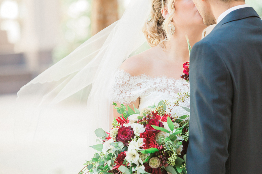 Amping up the vintage feel of the setting, Candace and Bobby used antique touches for their theme, incorporating old books, glassware and lace details. The pops of red in Candace’s bouquet work so well against the pastel backgrounds. Not only that…but the venue’s history worked well for these two teachers. Such a fantastic choice for an outdoor wedding!