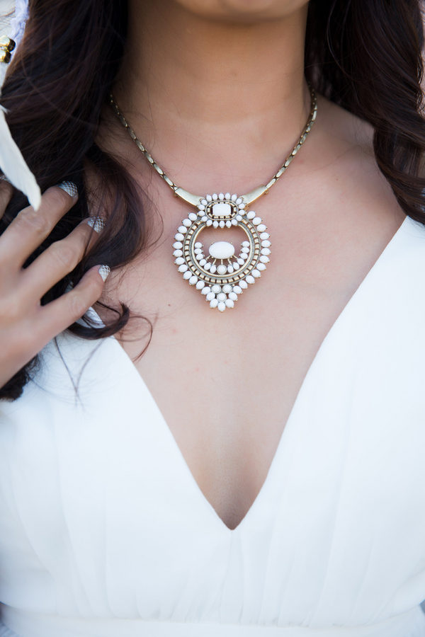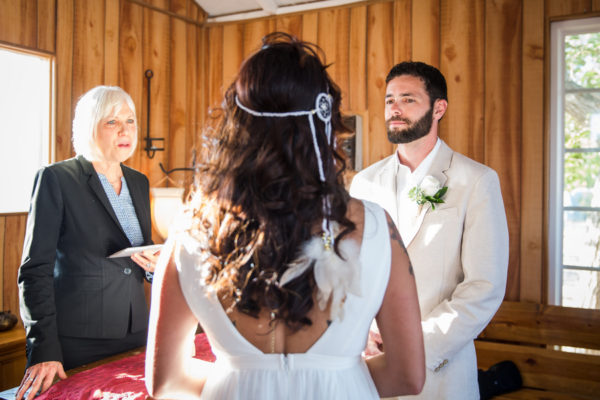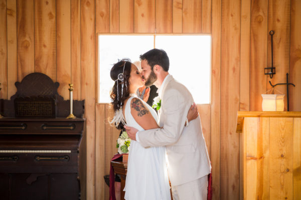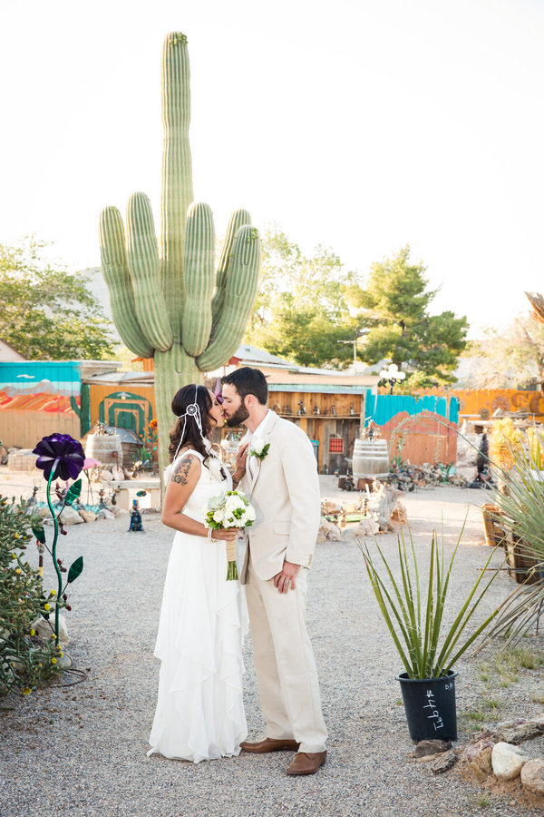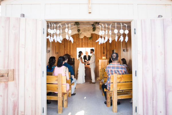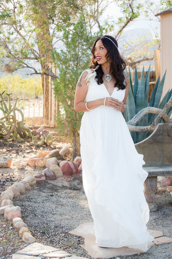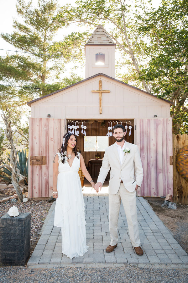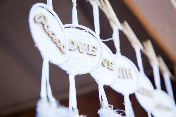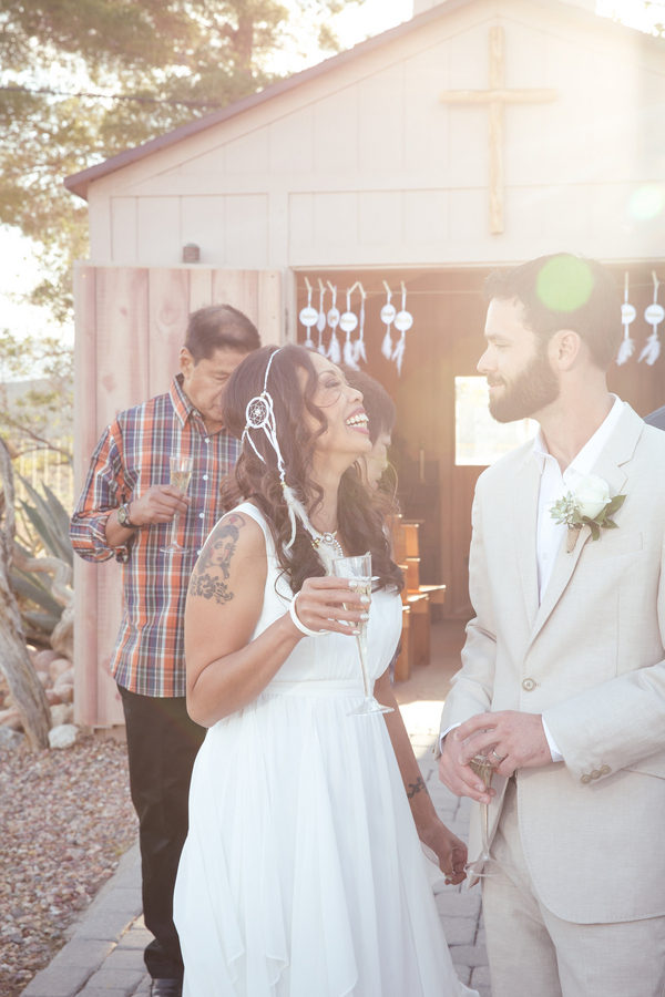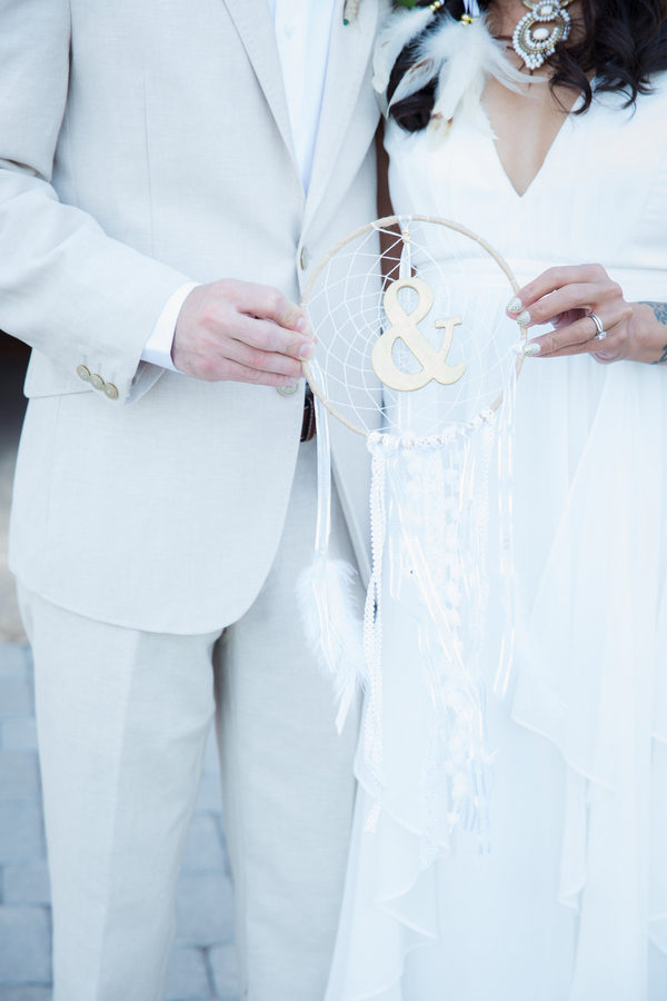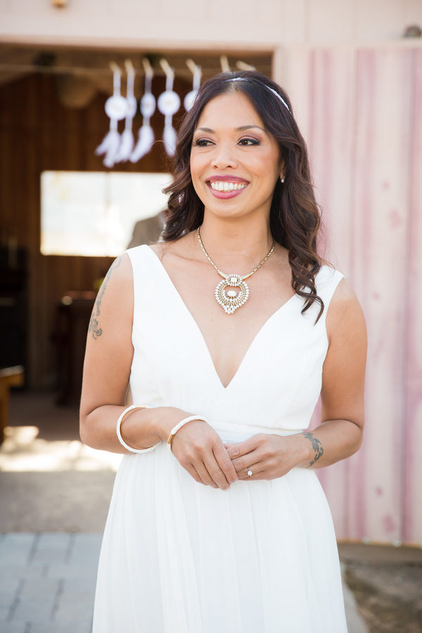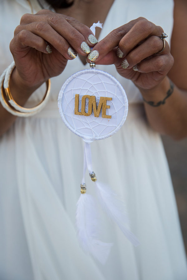 Distressed wooden accents and decorative metal surrounded the wedding chapel where vows were exchanged and fewer than 20 guests witnessed this intimate event at sunset. Zay’s choices of subtle gold accents with white made a statement, from her bridal headpiece and fingernail polish all the way to the couple’s wedding favors: dreamcatchers, made by the bride.