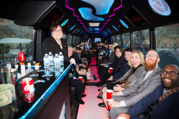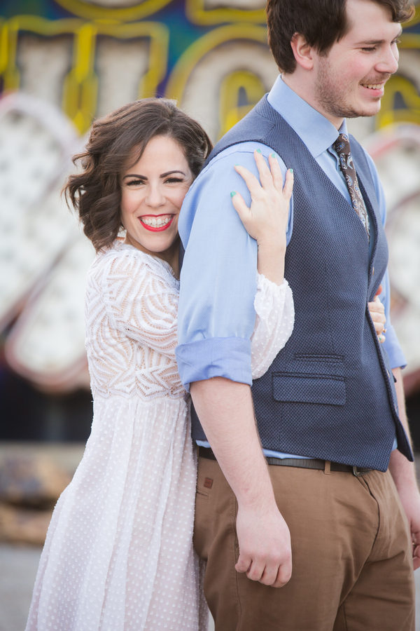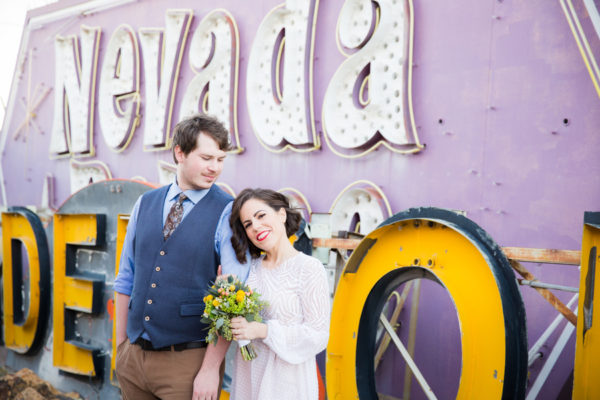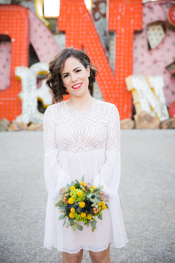After the wedding, the couple and their 30 guests literally got the party rolling by loading into the Land Yacht, a huge party bus perfect for this sort of occasion. The couple did some kitschy cool photos at the Neon Museum Boneyard and then headed out for more fun, including a family-style dinner at El Segundo Sol and late night drinks at The Peppermill’s retro Fireside lounge.