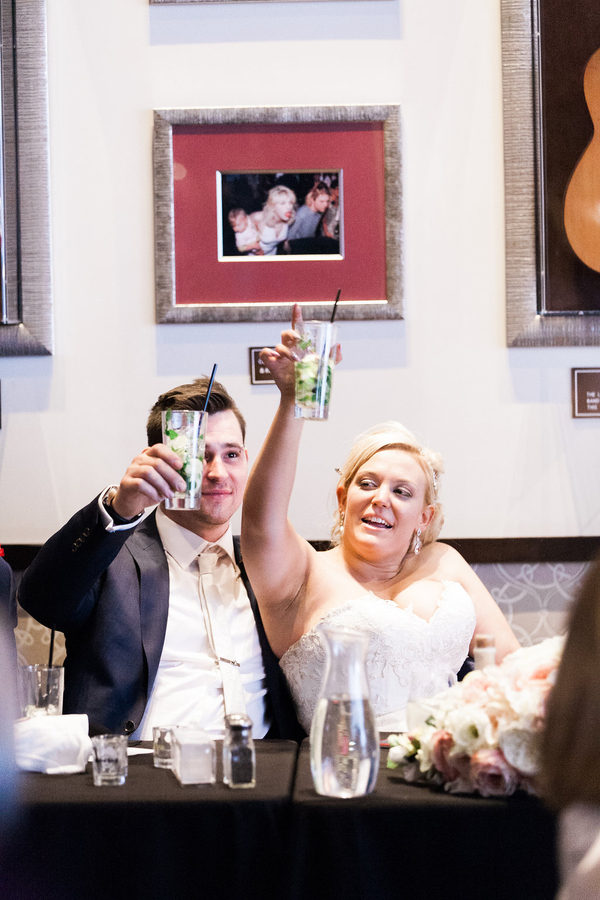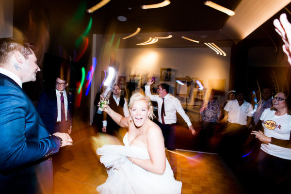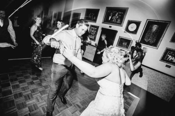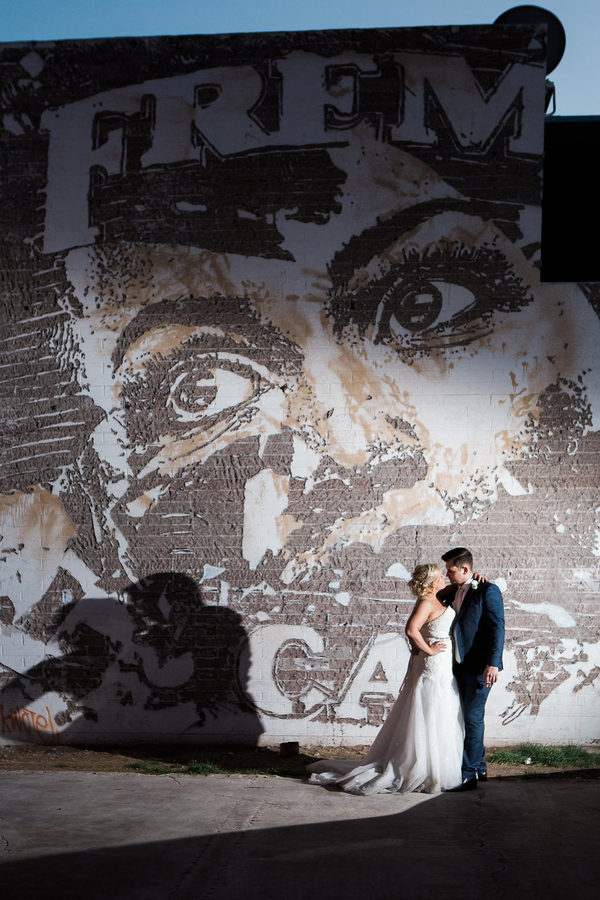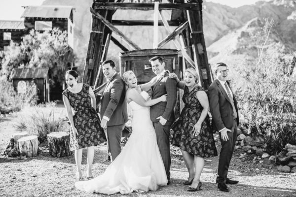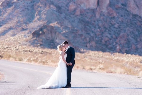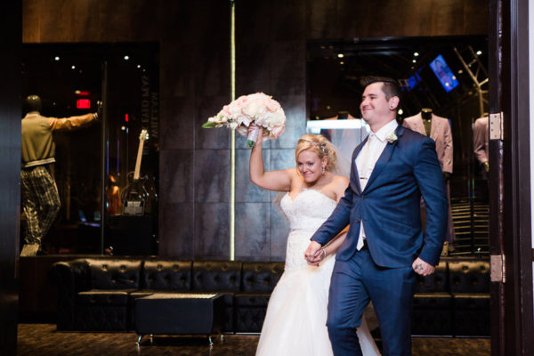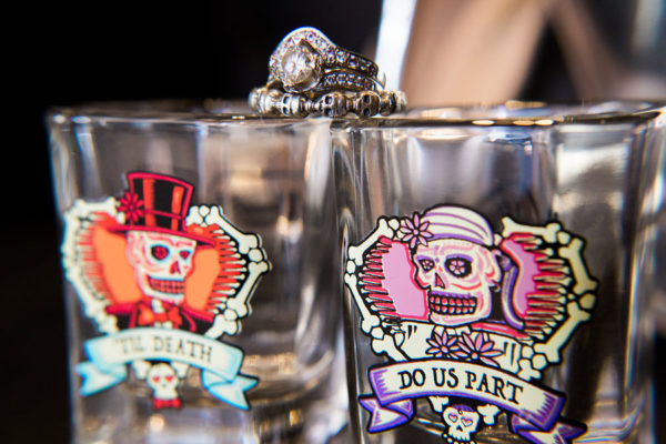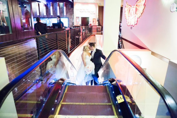 The couple chose a few iconic locations for their wedding photos, including El Dorado Canyon and downtown Las Vegas, rejoining their guests at Hard Rock Cafe for the reception. Their theme featured Day of the Dead design and details, with a very busy dancefloor. Surrounded by memorabilia from rock kings and queens with a view of the Strip from the patio, everyone celebrated until the wee hours.