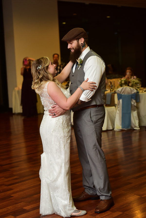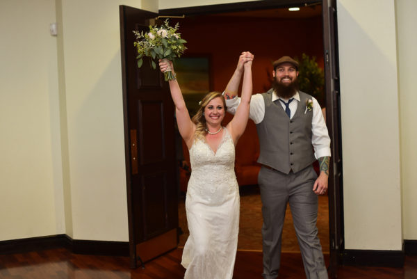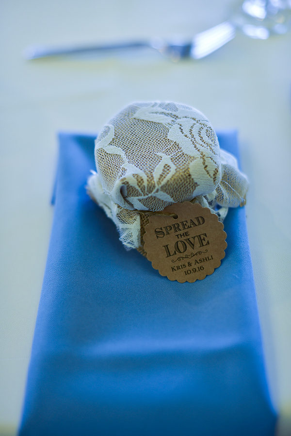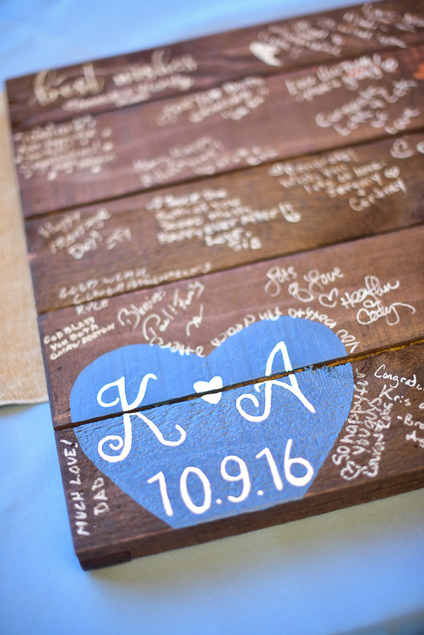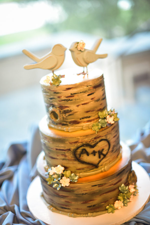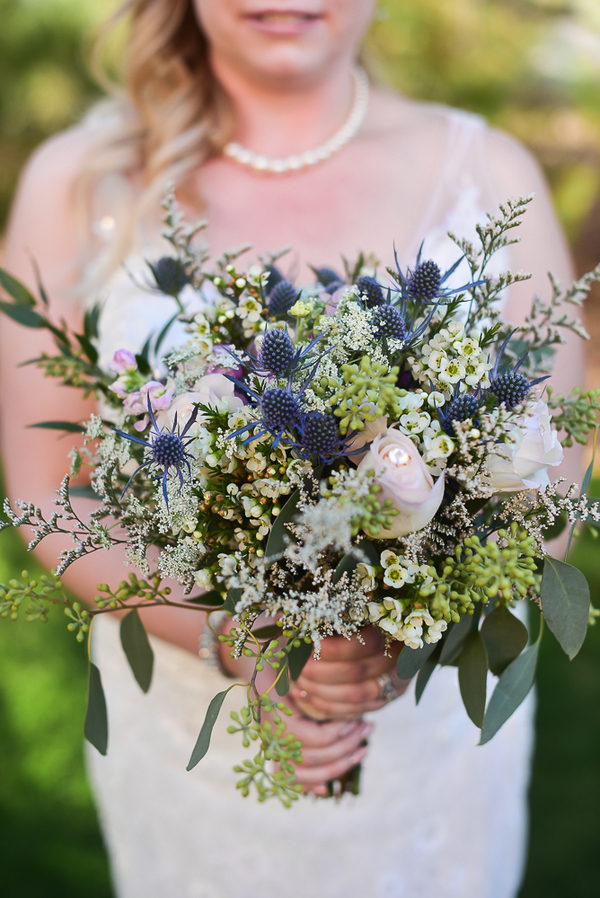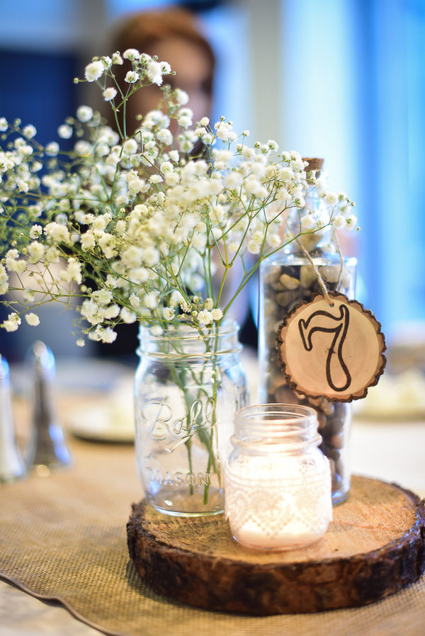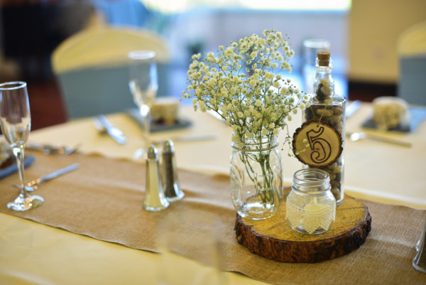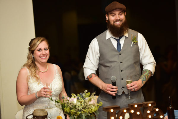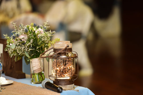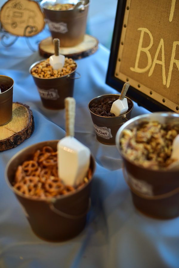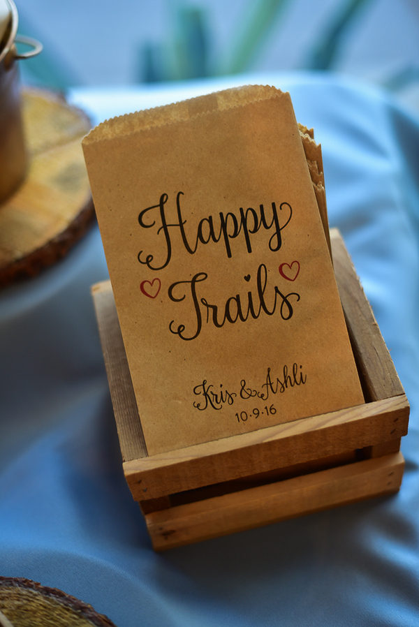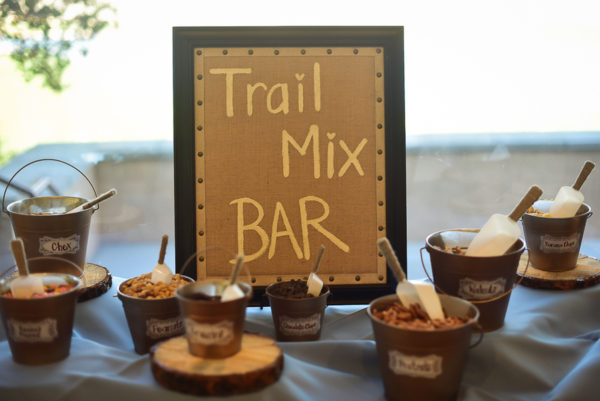 The level of detail this couple went to include in their wedding theme is amazing: from the camp lanterns and treestump wedding cake to the trail mix favor bar and centerpieces that would fit right into a country cabin, each detail is more fun than the last. Warm woods and textures like burlap and rock brought the outside in. Ashli’s wildflower-inspired bouquet even evoked a stroll through the woods. You’re probably not be surprised to hear this couple were engaged at the top of a mountain.