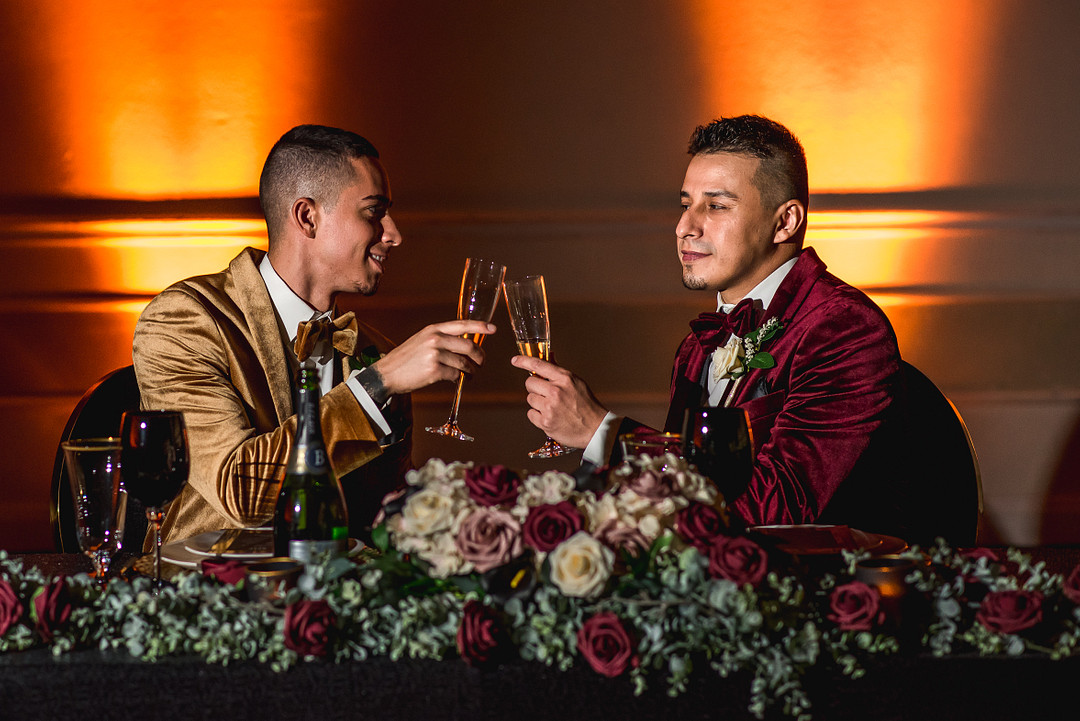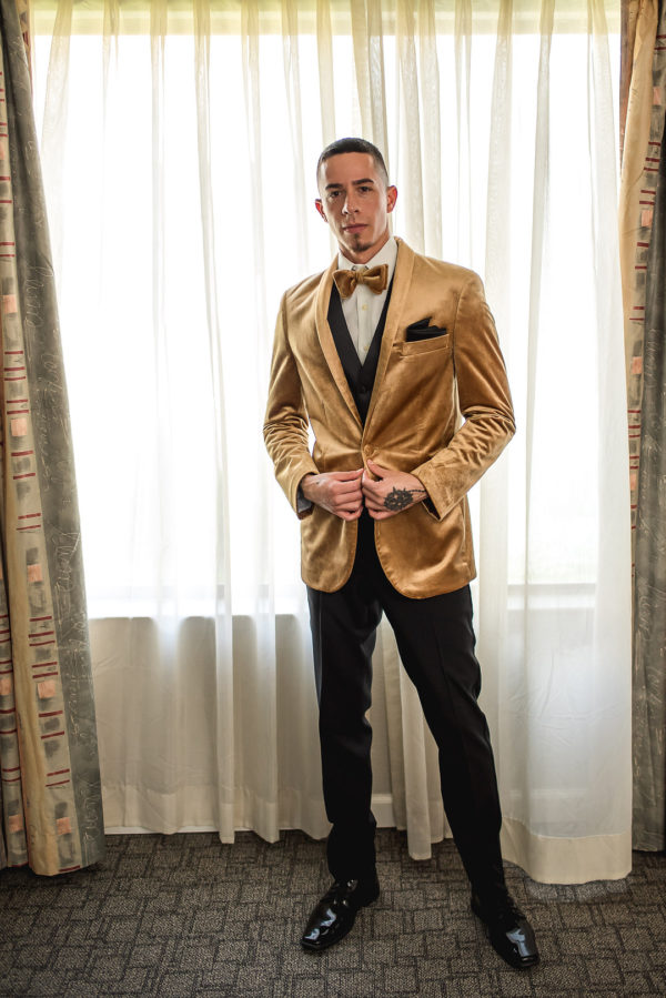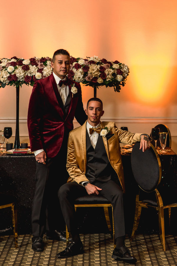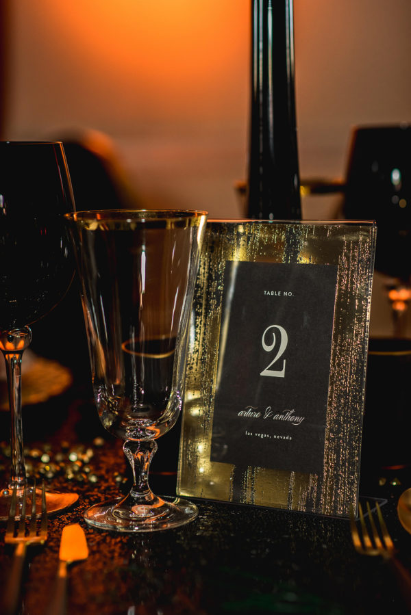 Dramatic florals and uplighting at the reception add to the theme, reminding me of a luxury New Year’s Eve celebration or another late night banquet or event. This elopement inspiration shoot at Alexis Park Resort combines garden and ballroom in a unique way, and it’s fabulous!