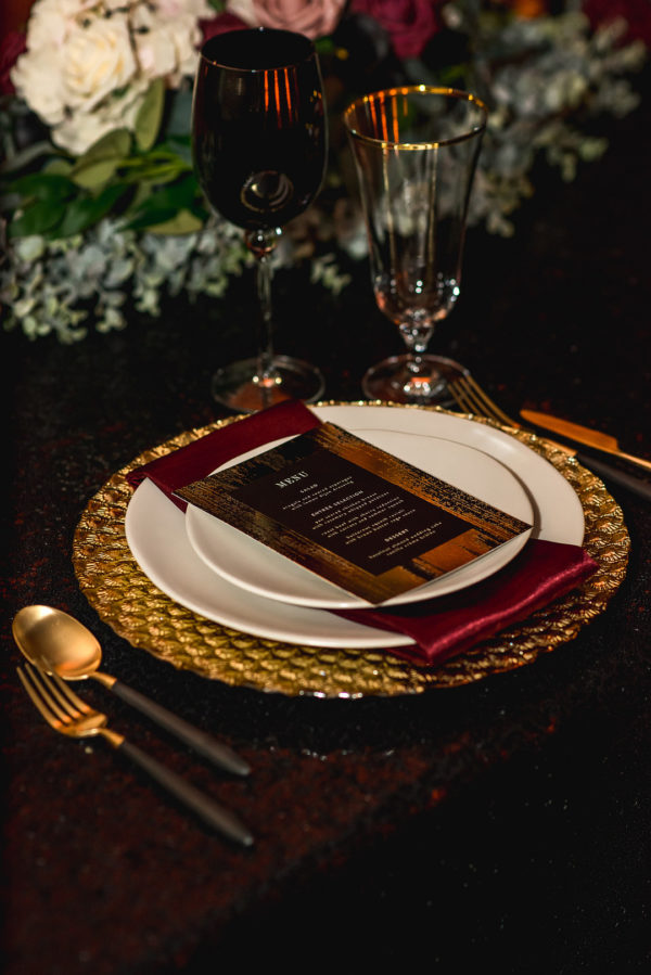 Who says your small and intimate Las Vegas wedding needs to be simple? Deep, deluxe colors accent this luxurious, moody styled elopement shoot. The burgundy, gold and black tones are so rich and seasonal, and perfectly complementary to the textures in the textiles and stationery. The visual impact is striking, and adds to the vintage feel.