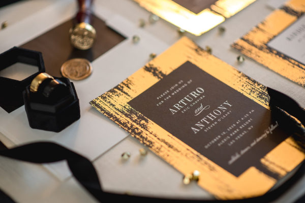 EVENT DESIGN + CONCEPT . Elle Lee Designs / OFFICIANT . Devin W. Pendergast / CAKE . Caked Las Vegas / FLORAL . Elle Lee Designs / FASHION . Friar Tux / LIGHTING . MODE Events / EQUIPMENT RENTALS . RSVP Party / INVITATIONS AND STATIONERY . Minted / MODELS . Anthony O’leary and Eric Chavira