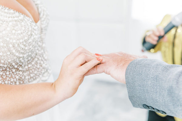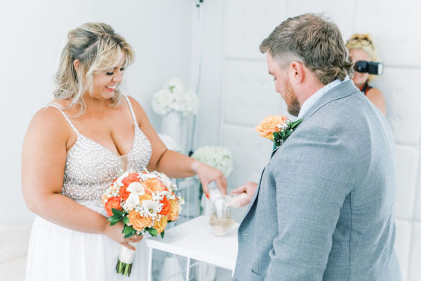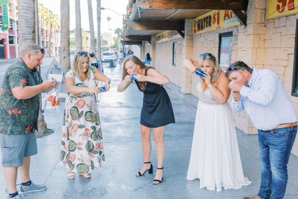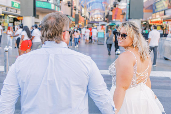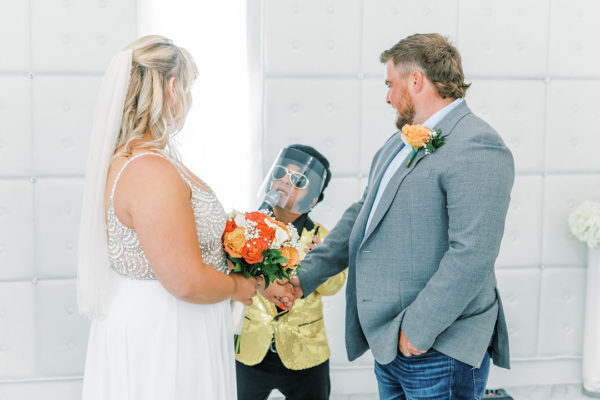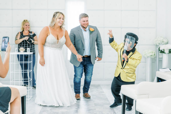 The day of, Kelsey and Mitch headed to Paradise Wedding Chapel to exchange vows presided over by “Little Elvis†a.k.a. Dimos the minister. Family and friends joined via livestream and heard Elvis celebrate the new marriage with a few songs.