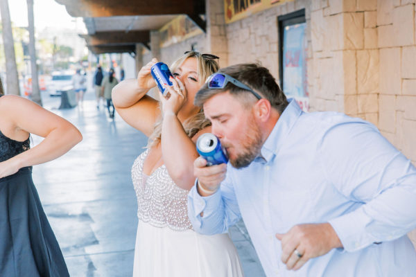 The best way to celebrate? A shared beer shotgun on the sidewalk with their witnesses after the ceremony before a few more portraits.