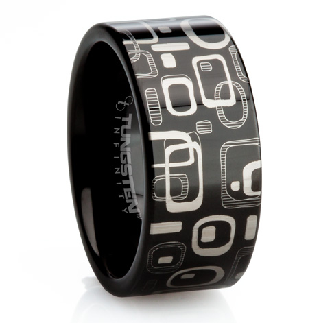 Since this IS a Vegas wedding blog, I couldn’t go without sharing a ring design with a nod to the theme! Siena is a really cool retro Mod-style etched tungsten ring. Love the black background on this one, it would certainly be eye catching, with the rounded rectangle designs on it! “Siena” is available for $199.